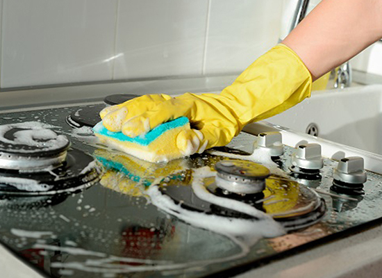 Detailed cleaning of countertops, sinks, appliances, and cabinets for a sparkling, hygienic kitchen.